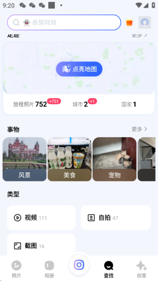 4、在查找页面可以了解旅程照片,还可以了解各类事件和类型等信息。