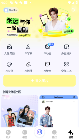 5、在创意页面中可以进行人像美颜、多图成片,还有各种智能化的美化图片功能。