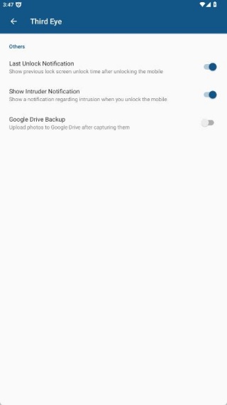 thirdeye 是一款超棒的隐私安全保护应用哦!它能帮您开启手机锁屏模式,只有输入正确密码、pin 码或者图案密码,才能解锁手机,从此手机隐私就安全啦,别人休想偷窥。而且它还有智能入侵偷拍功能,要是有人输错密码想解锁,就能触发自动拍照,轻松拍下入侵者,让偷窥者无处可藏。快来下载 thirdeye 安卓版,保护您的隐私吧!