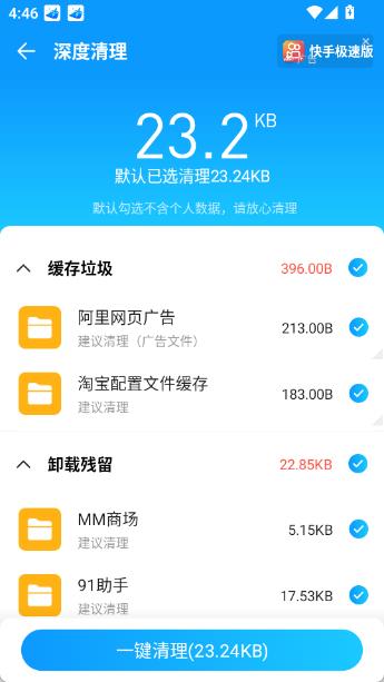 3、自由筛选需要删除的文件,支持一键清理手机垃圾;