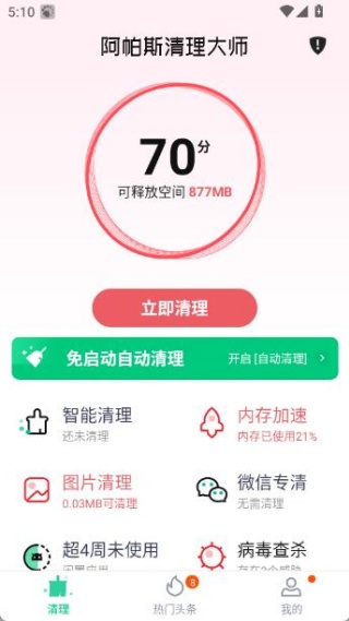 2、进入清理界面,点击一键清理、病毒查杀、内存加速等操作