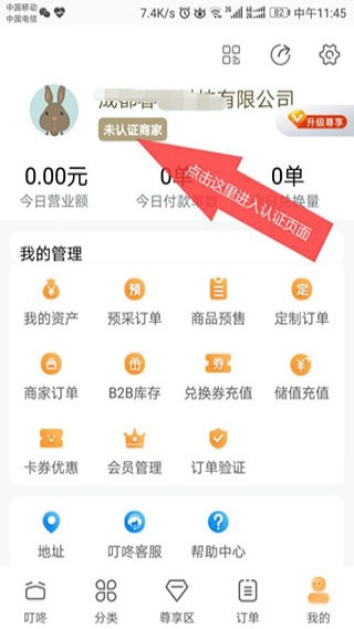 5、登录APP之后,点击右下角“我的”,然后点击上方的“未认证商家”进入认证页面。