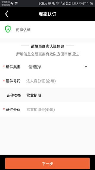 6、填写商家认证信息,商家名称、法人名称、联系方式、所在地区必填,填写完成点“下一步”。