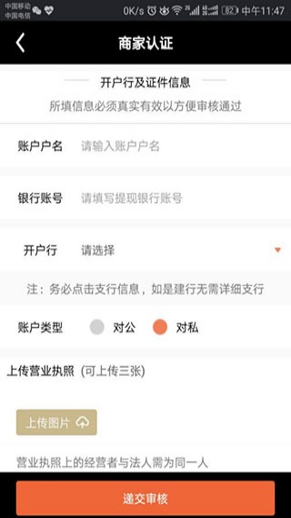 8、填写个人或对私银行卡信息,账户名称(一般为姓名)、银行卡号、详细的开户支行(建行无需填写开户行),上传“营业执照”照片。最好点击“递交审核”。等待后台即可。
