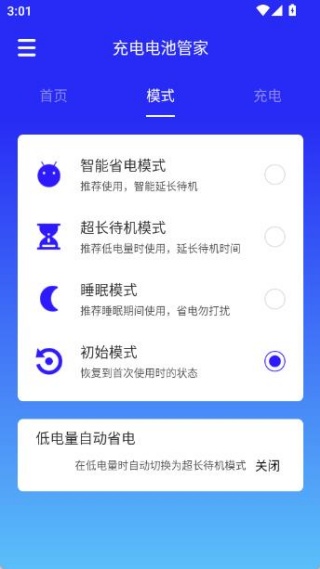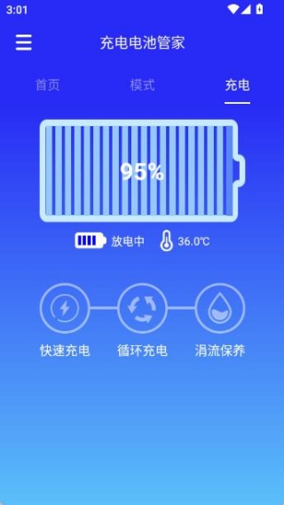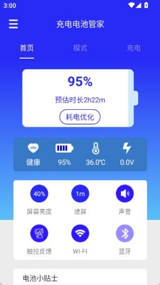 充电电池管家app是一款专门管理手机电池的软件。它能有效延长电池寿命,让手机电池更耐用。软件实时显示电量,电量不足时可开启省电模式,有性能、省电、超强省电三种模式可选,超强模式能最大化延长电池使用时间。还能查看电池温度,过高时清理后台高耗电程序,既能降温又能提升续航,快来下载安卓版使用吧!