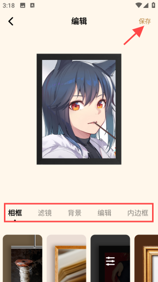 4、选择喜欢的相框,设置滤镜、背景等,预览后点击【保存】即可。