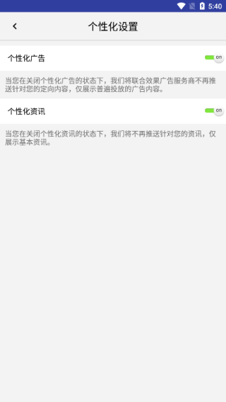 4、在个性化设置中可以开启或关闭个性化广告和个性化资讯。