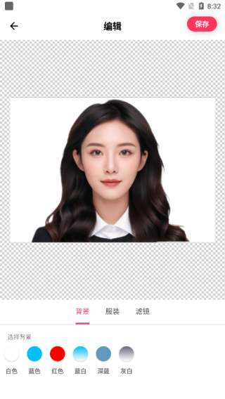 4、点击证件换装功能,然后选择相册中的图片,再选择背景、服装以及滤镜等功能。
