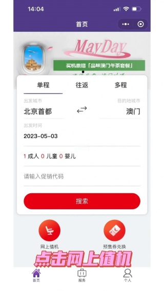 1、查询机票,能够在此查询澳门航空旗下全部航线的飞机票余票;