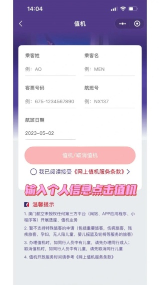 2、输入乘机信息,可以参考网上值机服务条款了解详情;