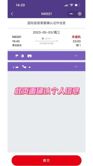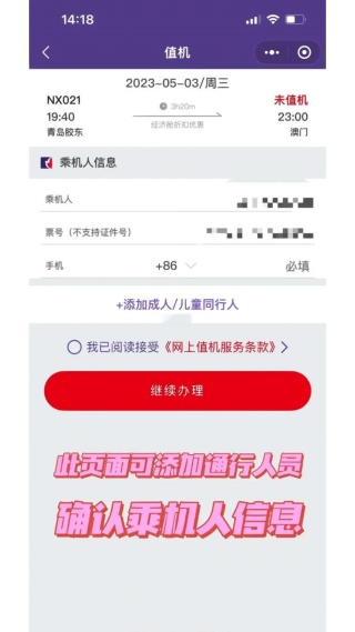 3、确认你刚才填写的乘机信息,然后可以添加同行人员。注意哦,每次最多只能添加3个人,儿童不能单独办理,要先输入成人信息,再添加儿童;