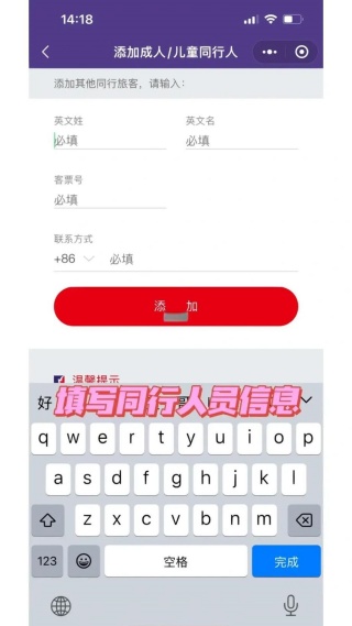 4、填写同行人员信息,按照提示填写同行人员的姓名和证件信息就好;