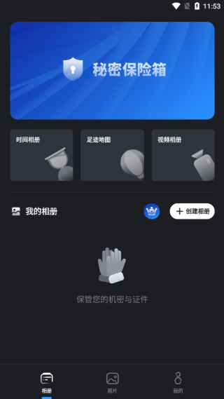 1、在相册页面中提供时间相册、足迹地图、视频相册,同时可以创建相册,还有私密保险箱;
