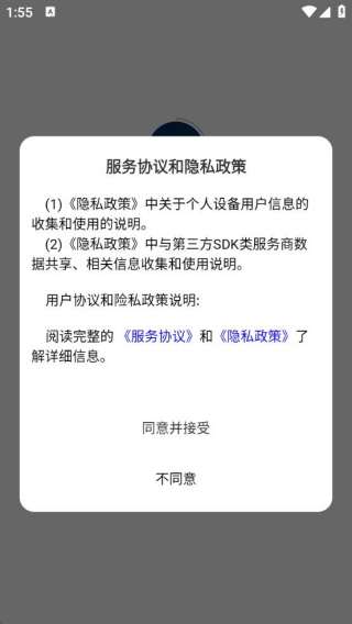 1、下载安装软件后进入,弹出服务协议和隐私政策,点击同意。