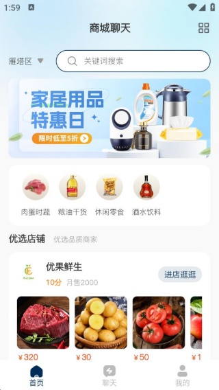 1、多品类聚合,将生鲜、家居、零食、酒水等不同品类商品整合在一个平台,方便一站式选购。