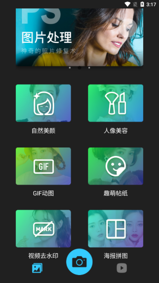 1、在首页中提供自然美颜、人像美容、GIF动图、趣萌贴纸、视频去水印和海报拼图的功能;