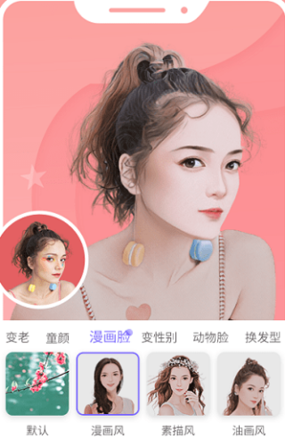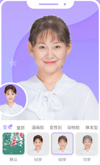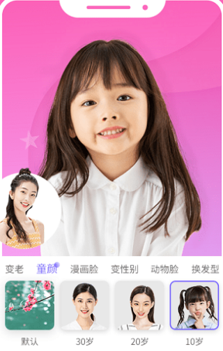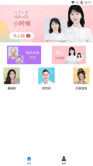 1、在首页中提供了老年长相预测、重返小时候、漫画脸、变性别和古装变脸等功能;