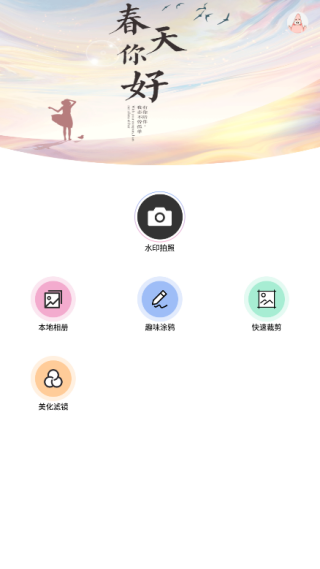 1、在首页中提供水印拍照、趣味涂鸦、快速裁剪以及美化滤镜等功能;