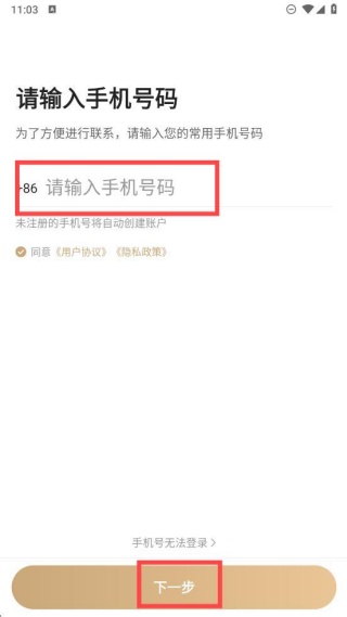 2、进入到登录页面,输入手机号获取验证码后,点击下一步即可;