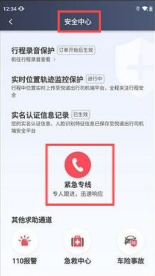 4、平台配备安全中心系统,遇到危险点击下方紧急专线按钮即可,会有专人迅速响应。
