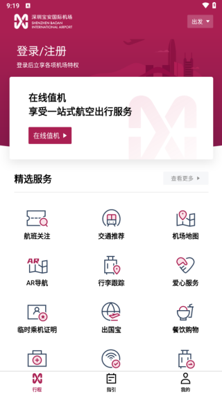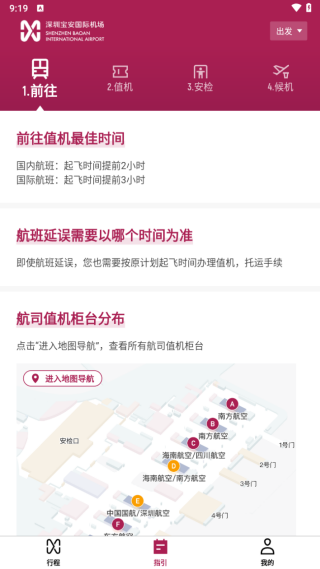 3、具有行程指引导航,包含“出港、进港、中转、接送机”四大主要流程指引;