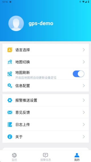 4、在我的页面,支持地图切换功能,还有报警推送设置等其他功能。