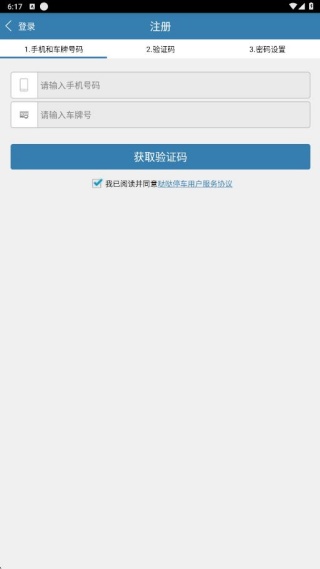 3、没有账号的各位,进入注册板块,提交手机号、车牌号等信息;