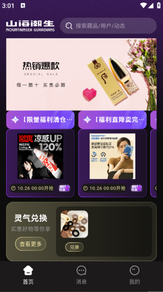 2. 在主页面即可看到搜索功能、限量福利清仓、灵气兑换等功能;