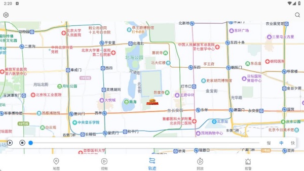 4、在轨迹页面,点击播放视频轨迹,轻松掌握出行路线轨迹;