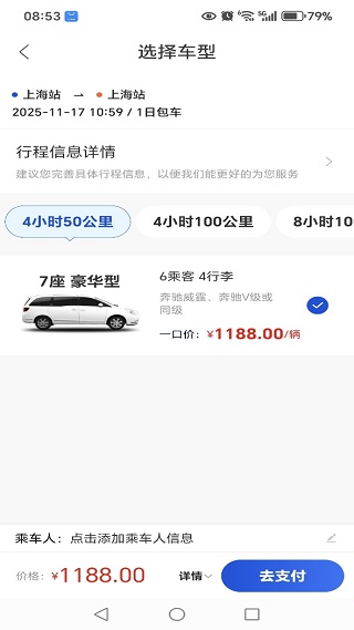 4、一键展示车型信息,对应价格也有,觉得合适立即下单包车成功。