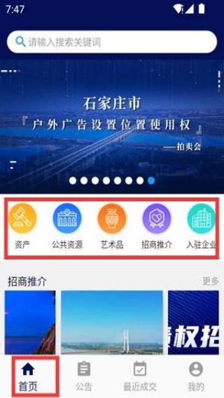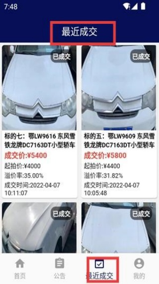 3、点击底部导航栏最近成交选项,进入最近成交页面,展示已成交的拍卖标的信息。