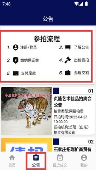 2、点击底部导航栏公告选项,进入公告页面,上方清晰展示参拍流程,帮助用户全面了解拍卖详情。