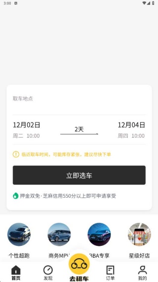 1、进入app首页,展示了立即用车功能,便于我们选车并租赁;
