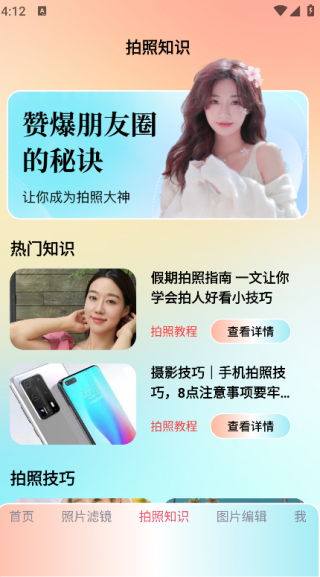 4. 点击页面下方的‘拍照知识’,即可学习专业的拍照技巧。
