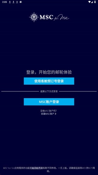1、下载并安装,平台支持客舱预订号登录与 msc 账号登录方式,可自由选择;
