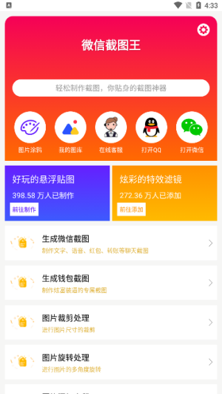 1、启动应用后,可体验图片涂鸦、悬浮贴图、特效滤镜、微信截图生成、钱包截图生成等核心功能;