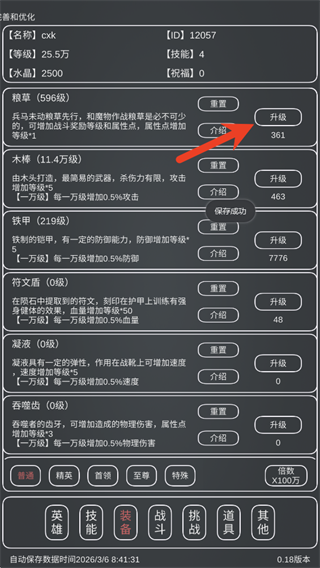 2、装备与怪物存在对应掉落关系,随着挑战进度提升怪物强度,以粮草类装备为例,升级后可获得属性点或直接提升基础属性。