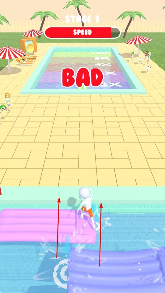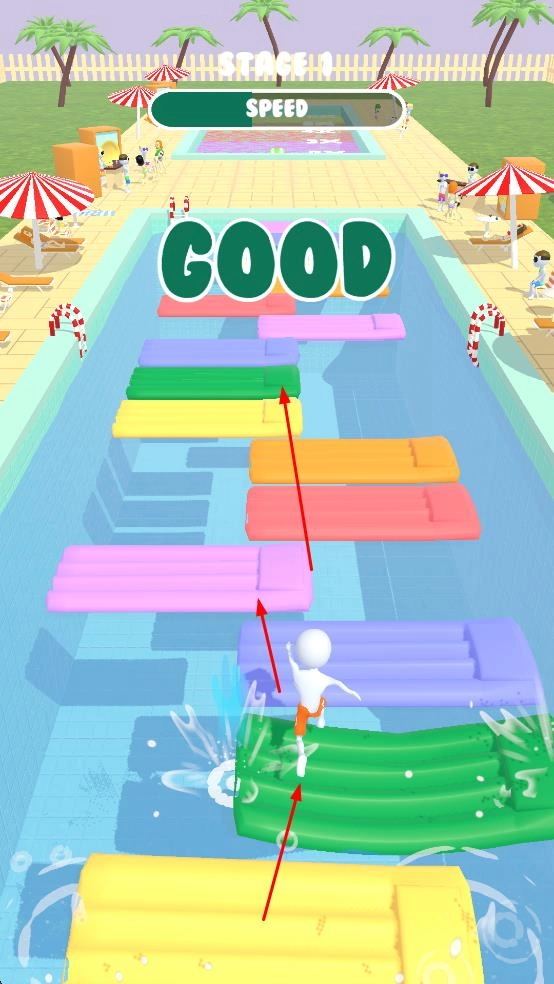 当看到标有stage1的关卡标识时,即可操控白色小人角色在泳池场景中展开跑酷。该角色具备前后左右移动的能力,此为开启游戏的关键操作,完成这一步便能顺利开启游戏之旅。
