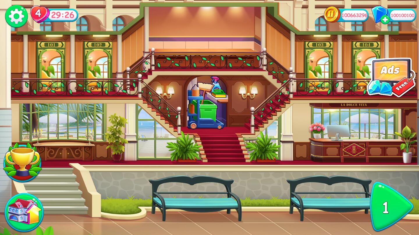 3、收集喜欢,赢得越来越多的爱并获得认可,升级您的酒店,经营高端酒店并赚更多钱。
