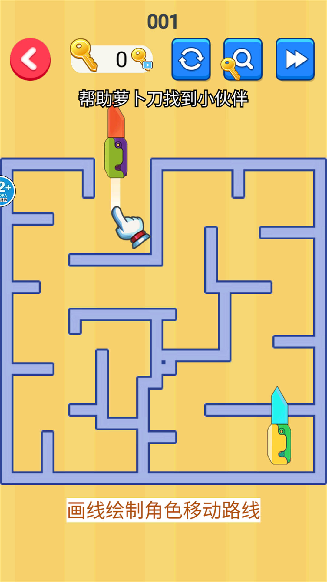 1、仔细的观察迷宫,然后画线去帮助萝卜刀找到它的好伙伴;