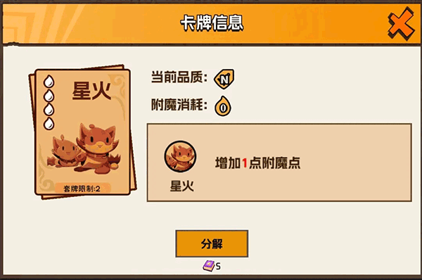 未雨绸缪可以使自己在下回合少摸能量卡时要弃置一张牌,启动有延迟,不过也不失为一张好用的卡牌。而星火则是0费附魔还能获得1附魔点,相当于稳过一牌还赚一点,不过有能力的小伙伴也能试试换成例如如意(ur)等能获得附魔点的牌。