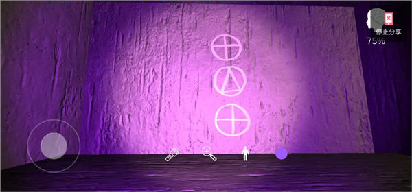 19、点击花瓶旁边的盒子,得到手电筒,打开手电筒,分别得到,翡翠手镯旁边的图案、唱片机上的图案以及通道尽头,平面上方的图案;