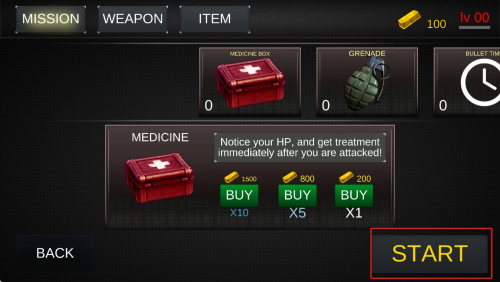 3、如何购买道具?在准备界面,选择“ITEM”标签,购买所需的医疗包、手榴弹等道具,然后点击“START”开始游戏。