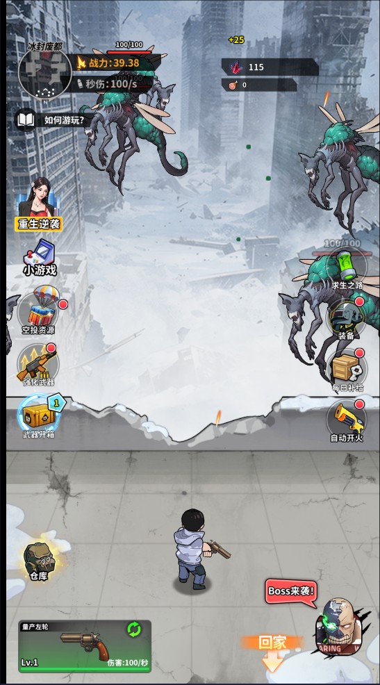 2、点击屏幕来击杀怪物。玩家使用武器攻击异形怪物