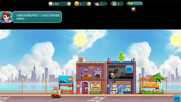 3、商场如战场,抓住时间就等于抓住了商机,游戏中事先设计了一栋公寓和一间商店,玩家首先需要点击商店开始销售货物。