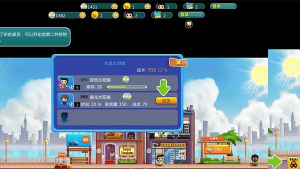 13、点击“继续”,则可以在店铺中看到可进货的货物,如偏光太阳镜,并显示货物的进货量及成本,觉得货物价格和数量合适,点击“进货”即可,且界面同时还提醒物品的库存量。