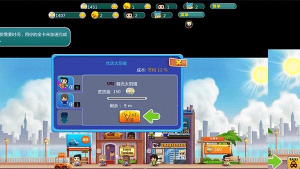 14、 当然,进货需要时间,但玩家不想等待,则可以利用金卡来加速进货过程。确定用金卡加速进货后,可以点击商店开始加速进货。