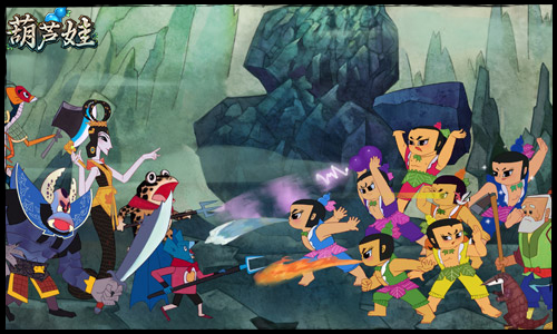 4、四娃:炉火纯青,刚阳烈焰。绿娃四弟乃天界火神下凡,可任意吞吐烈火。据说刚阳之火,温度达到一定程度时,火焰乃呈青绿色。但他误饮冷泉酒,醉冻寒冰石。后被六娃所救。