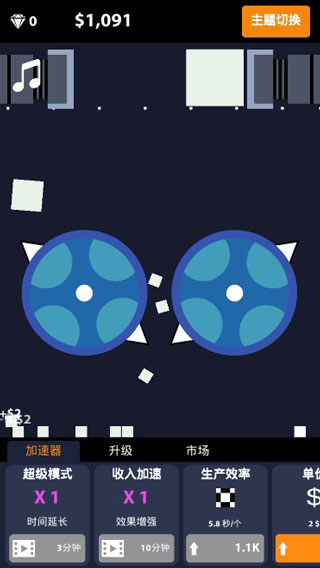 游戏玩法:总体来说比较简单,仅由加速器、升级和市场三位要素组成,右上角还能自主切换主题。