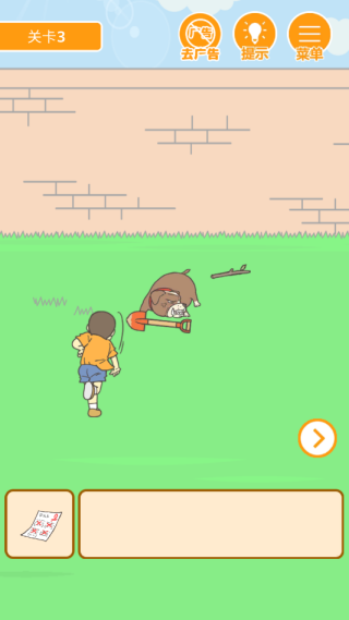 3、从右侧场景的光头角色手中取得木棍,返回用木棍引开狗狗后获得铲子,再到右侧挖土埋藏试卷。